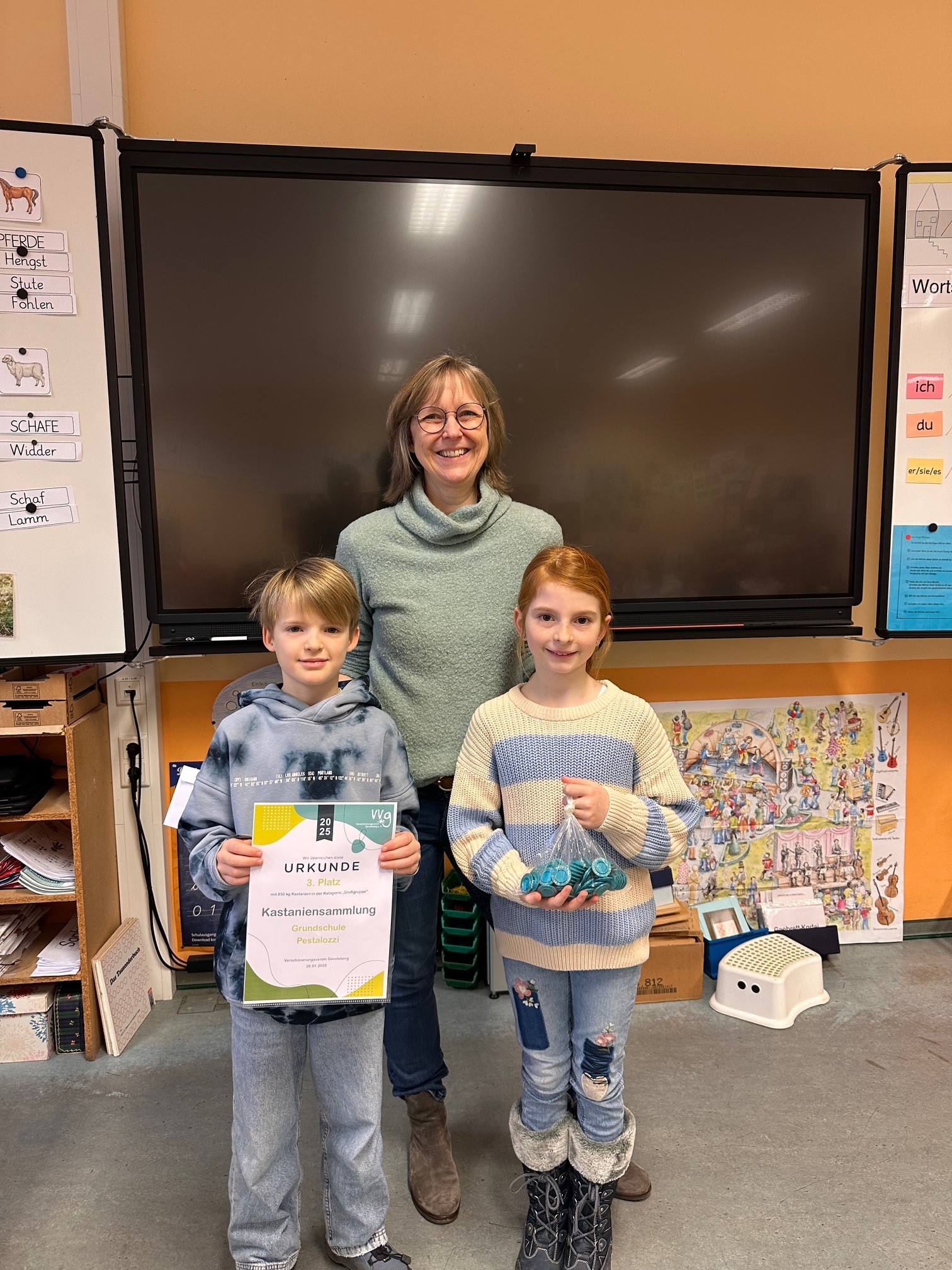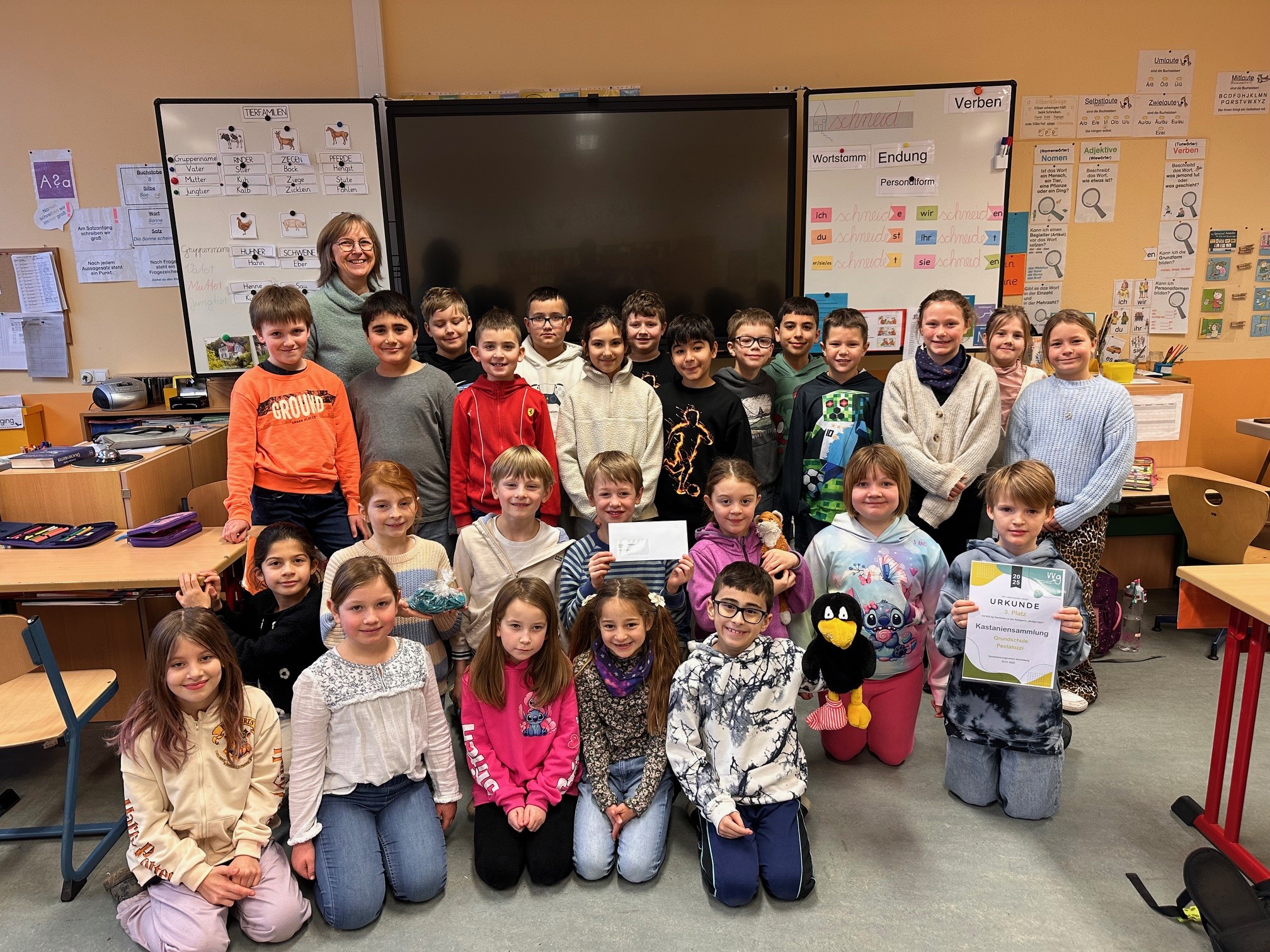 Die Klasse 3A der Grundschule Pestalozzi hat sich mit großem Engagement an der diesjährigen Kastaniensammelaktion des Verschönerungsvereins beteiligt. Unter der Leitung von Frau Pfleging sammelten die Schülerinnen und Schüler fleißig Kastanien und kamen dabei auf eine beeindruckende Menge von insgesamt 850 Kilogramm.